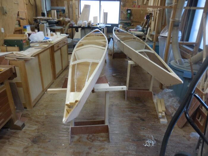 制作途中の2艇です。1艇は18フィート、もう1艇は16フィートで、幅は58センチと54センチです。シーカヤックに1人で乗るのは死にに行くようなものなんで、だれかお供を連れていくために2艇が必須なのです。