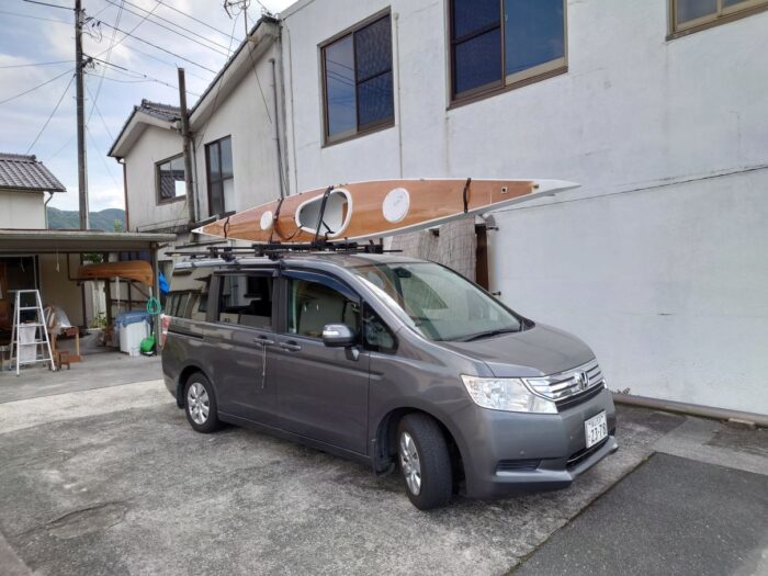 去年の7月の写真です。カヤック積載用のキャリヤーを追加購入し、積載確認してます。この後2艇積んで車で1時間ほどの近場の海浜公園に進水式に出かけました。3人で行ったんで1艇は公園で借りましたが、プラスチックの貸出艇に比べると格段に軽快で、ミズスマシの様に、海面を滑るように滑走します。漕いでる時の感覚は、このままどこまでも漕いで行けそうって感じで、実に爽快な気分でした。
