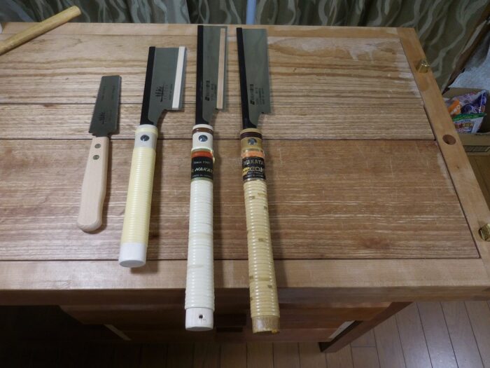 一番左がSUIZANのダボ挽き、つまりアサリの無い鋸です。工房ではカネジュンのダボ挽きを使っていますが、厚みのあるこのダボ挽きが組子には使い易いだろうと思って導入しました。