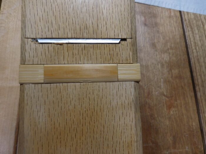 この竹の部材で加工材が刃に食い込んで台から浮き上がり、余分に削れる事を防ぎます。