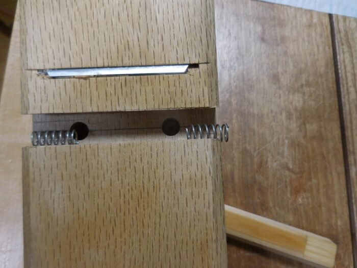竹の部材は蟻型に掘られた溝に仕込むんですが、その中に竹部材を押すバネを仕込んであります。教科書では板バネを使ってましたが、板バネのサイズやら反発力の選択とコントロールが難しそうなので、コイルバネを使うことにしました。これならバネを任意の位置で切って、反発力をコントロールすれば良いでしょ?コイルバネはHCで売ってる奴にしました。ミスったらいくらでも替えがききます。