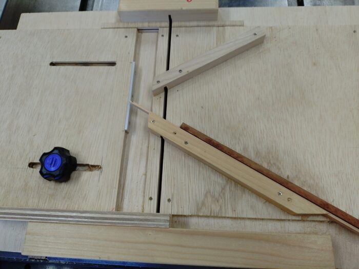 3.のやり方で、海外のユーチューブの中で使い易そうな奴をコピーしました。刃の通り道に対して左上がり60度にセットしたフェンスに部材を添わせてワンカット、左にあるアルミの小さな部材にワンカットした溝を嵌めて2番目をカットします。順次繰り返せば同じ送り幅で何か所でも同じ幅でカットできるっていう理屈です。いかにも西洋人らしい発想ですね。
